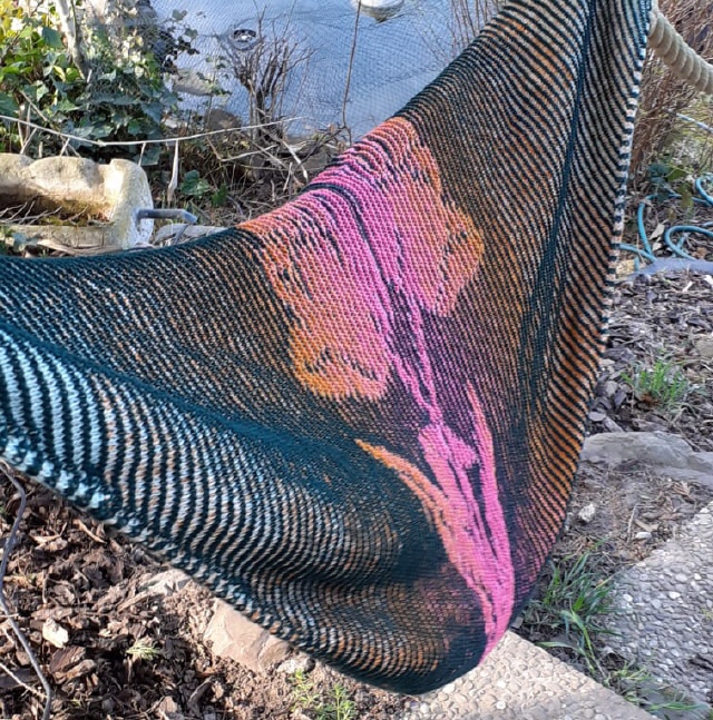 Gestrickt wird mit 2 Farben. Beim Illusionsstricken sieht man von vorne nur ein Streifenmuster und das schöne Motiv wird beim seitlichen Betrachten sichtbar und ändert je nach Blickwinkel die Farbintensität. Gestrickt werden nur rechte und linke Maschen.